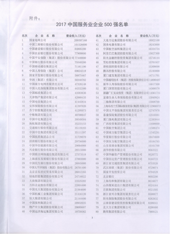 2017年,青海物產在省委、省政府、省國資委的堅強領導和親切關懷下,在省屬相關委廳局的熱情幫助和大力支持下,牢牢把握"穩(wěn)中求進、改革創(chuàng)新、又好又快"的原則,搶抓機遇,攻堅克難,扎實工作,保持了營收穩(wěn)步增長的良好態(tài)勢,集團再次入圍"2017中國服務業(yè)企業(yè)500強",排名第397位。