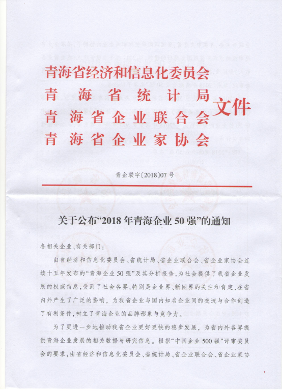 (集團總經辦?訊 戴淑琳/文)2017年,青海物產緊緊圍繞"穩中求進"工作總基調,全面落實五大任務新措施,主動適應經濟發展新常態,積極融入"一帶一路"建設機遇期,全力以赴創收增效,全力推動項目建設,全力促進轉型升級,保持了營收穩步增長、效益穩步提升、項目平穩推進、結構不斷優化的良好態勢。近日,青海省經濟和信息化委員會、省統計局、省企業聯合會、省企業家協會聯合印發了《關于公布"2018年青海企業50強"的通知》(青企聯字〔2018〕07號),青海物產再次入選青海企業50強,名列第12位。