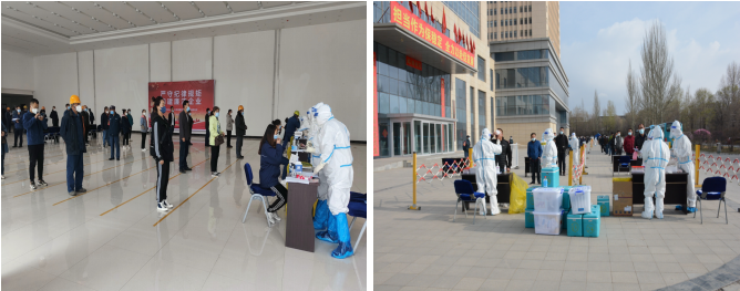 在疫情防控緊要時期,主動配合落實核酸檢測等防控措施。多頻次聯系大通縣疫情防控指揮部及北川園區管委會,于4月14日、4月17日開展兩輪核酸檢測行動。為做好本次核酸檢測工作,公司黨政領導班子高度重視,科學謀劃,與相關單位溝通銜接后,連夜加班在園區空曠區域設置檢測點,方便核酸檢測工作;同時根據公司生產經營實際,公司財務審計部、實業開發部人員、供銷部負責同志協同公司所屬各單位,密排人員在崗、離崗、休班情況,提前編制完成人員信息統計及分組排序表;歷經全員密切配合,兩次共采集核酸檢測樣本2093個,保證了篩查應檢盡檢、無一遺漏,及時排除風險